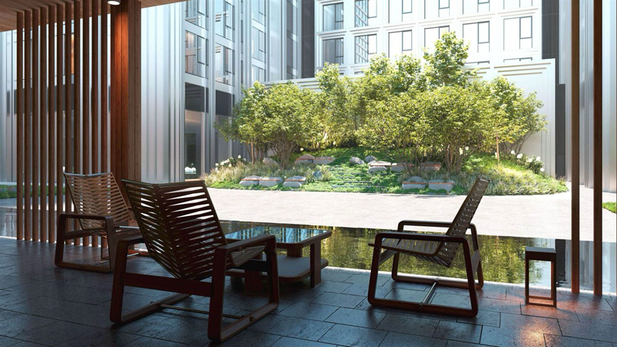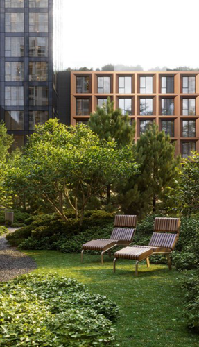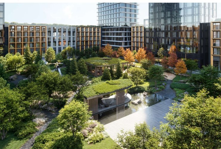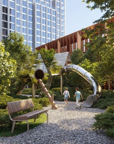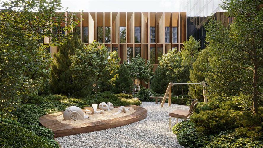На территории жилого квартала запланирована современная школа, детские сады, рестораны, фитнес-центр с бассейном, летние веранды и кафе, а также детский центр и школа искусств. Внутренняя территория двора разделена на 4 зоны, плавно перетекающие друг в друга и объединенные сетью уединенных маршрутов. Во дворе оборудованы игровые площадки для детей разных возрастов, спортивная зона, зона отдыха, чайный домик, пруд с навесом и амфитеатр. Для владельцев автомобилей предусмотрен теплый двухуровневый подземный паркинг на 695 мест c зарядками для электромобилей, сервисом подкачки шин и велопарковками.